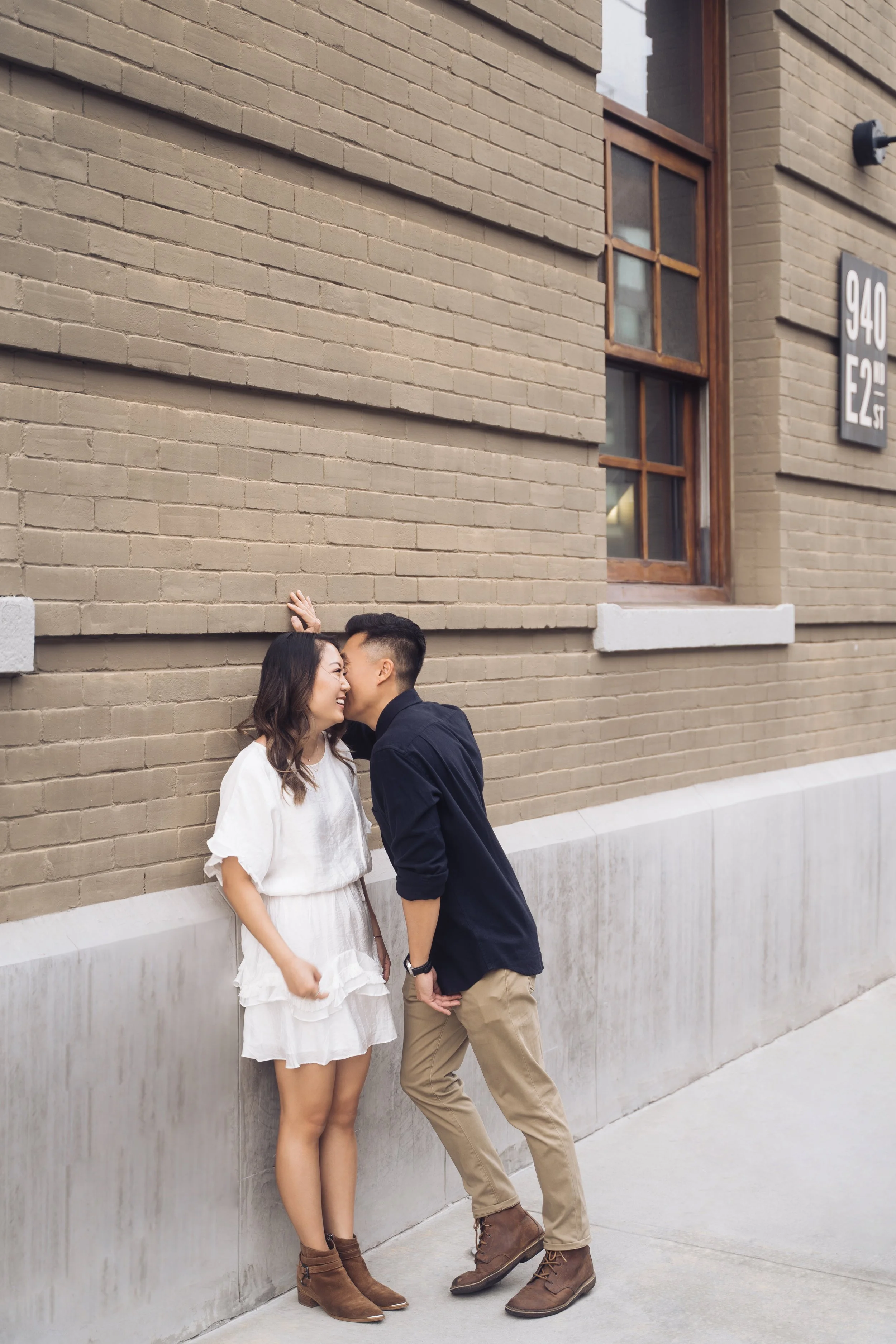 Kissing on cue can be awkward if there is an audience watching. That’s why rubbing noses together works as well. Sometimes it can work better. By touching noses you get the intimacy of closeness. Without having to do a kiss. Also, this pose can result in more serious or smiling reactions. Both are great! It’s all about capturing what the couple does when they touch noses together. Sometimes the silly moments give the best shots!